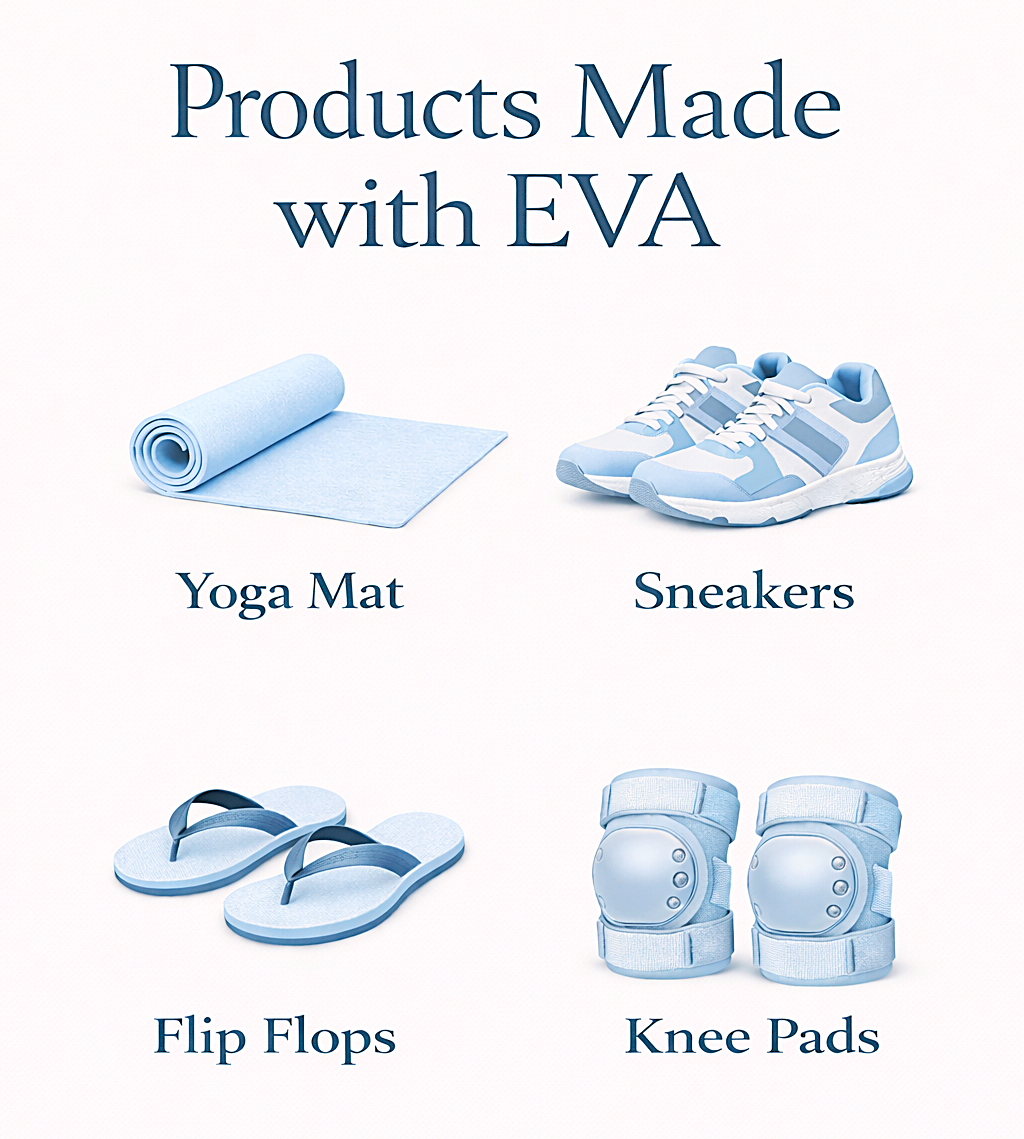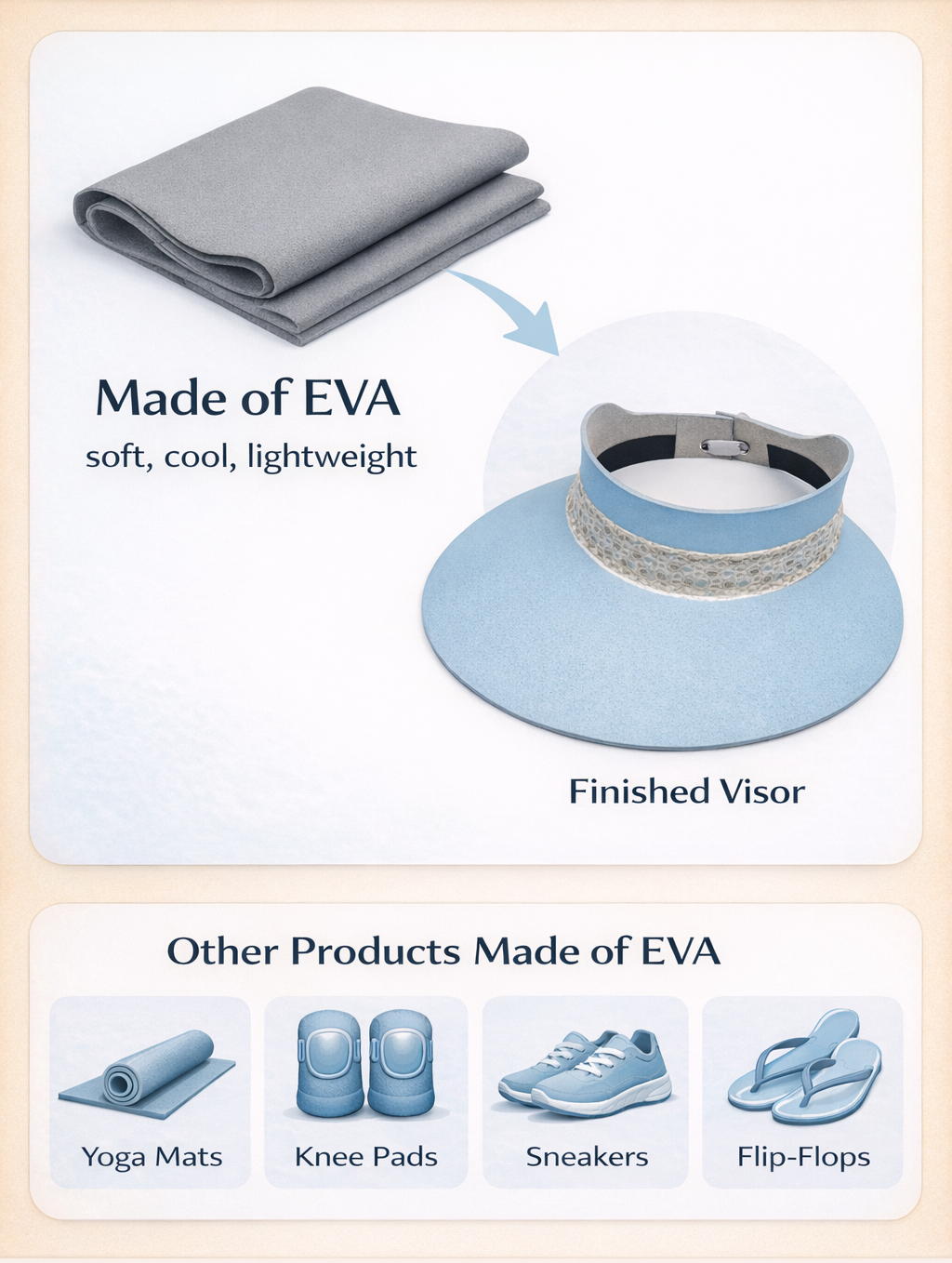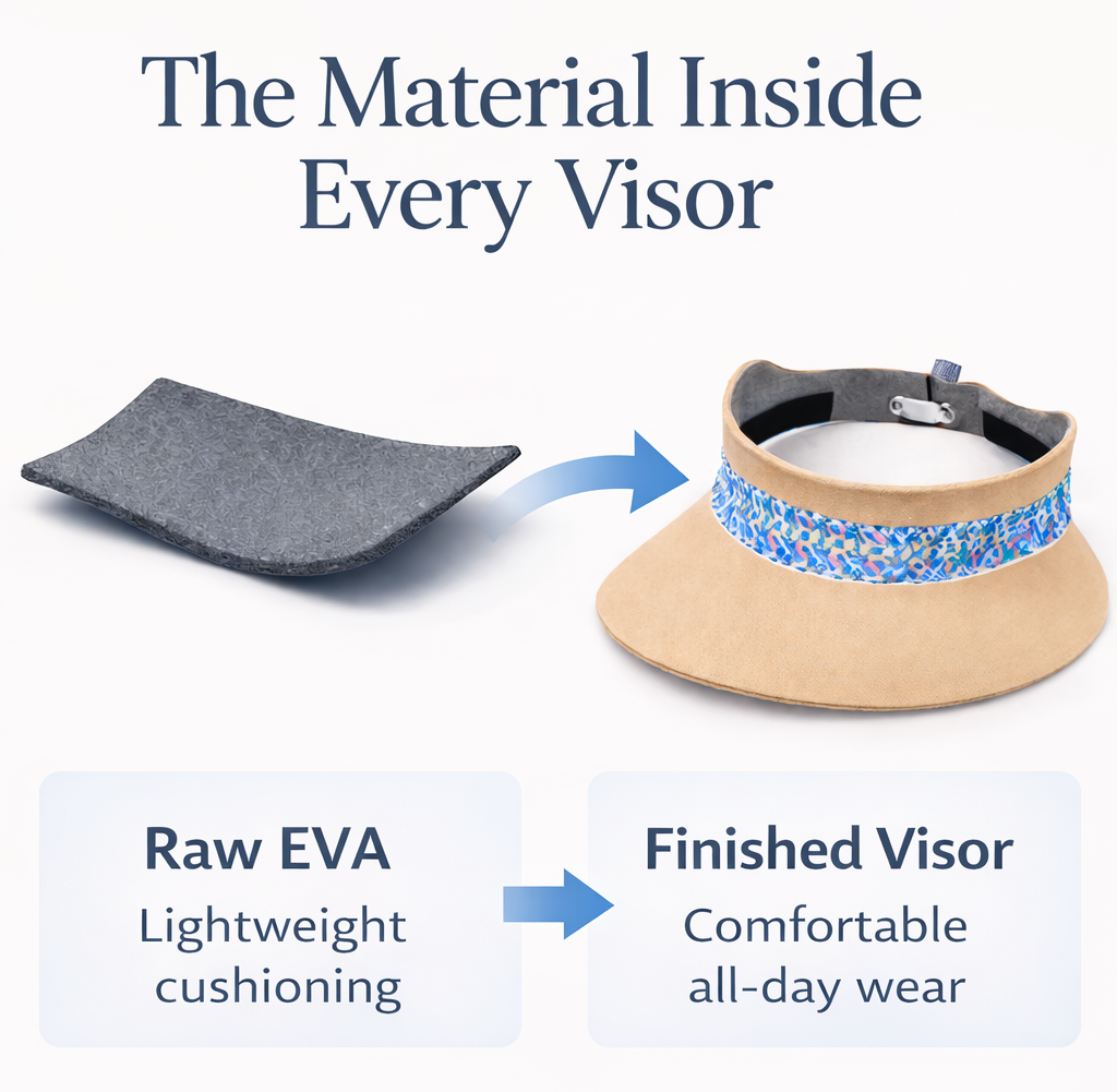 These hats are made from two kinds of Coated EVA. A softer material is used around the head and a more structured material is used for the brim. Coated EVA is commonly found in sneakers, yoga mats, and knee/helmet pads. It feels very similar to a soft, cushiony memory foam and is very comfortable.