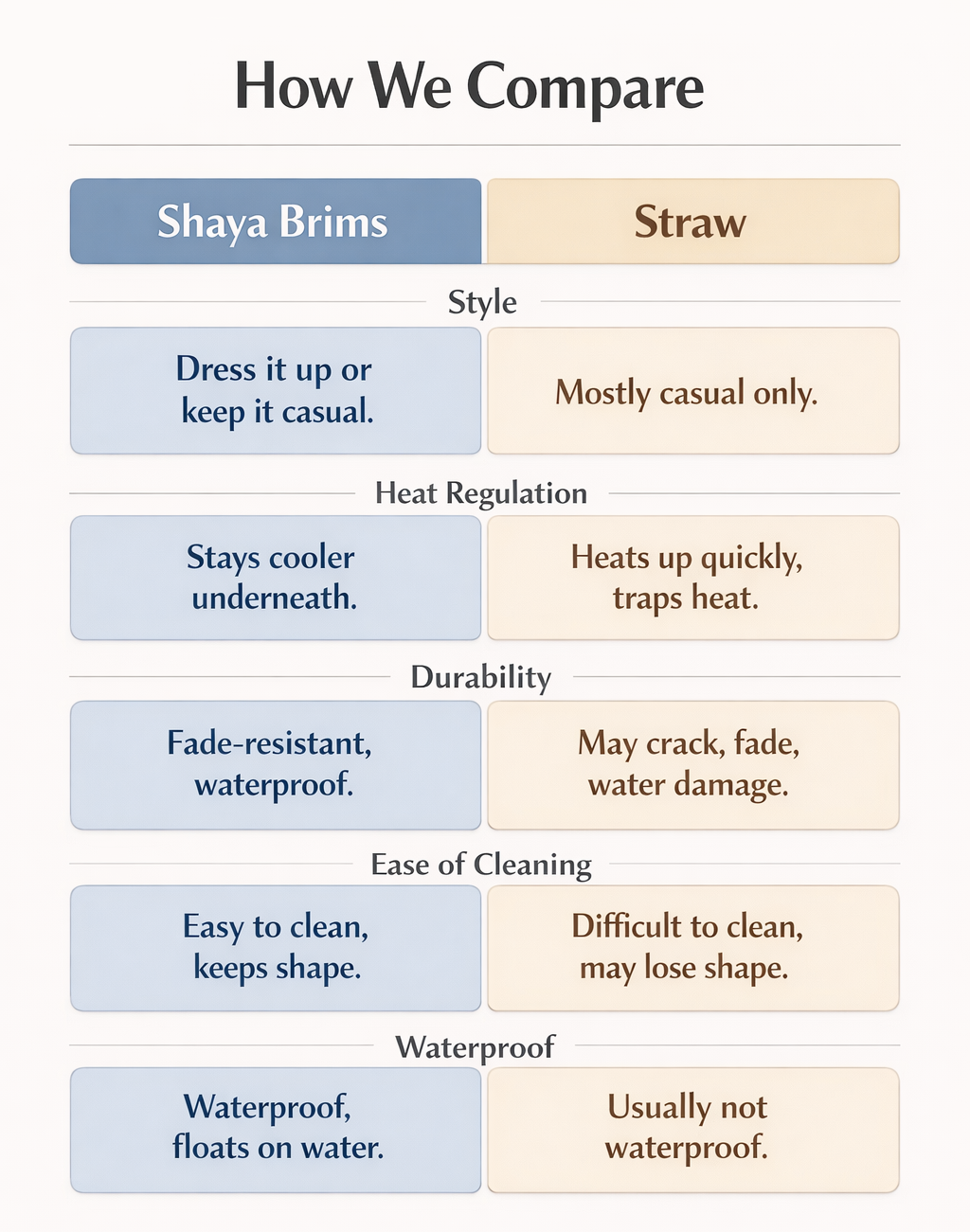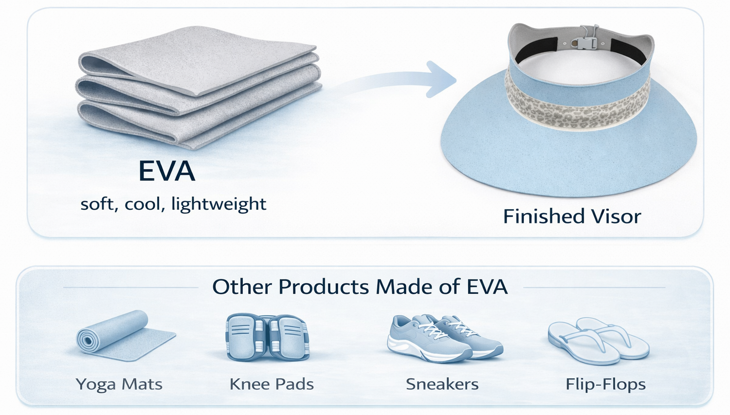 Our Visor Hats are made from a stays-cool EVA material - the same lightweight, non-toxic material used in yoga mats and sneakers. It's soft, UV-resistant and safe for all ages. The decorative bands are made from durable natural fibers like hemp and bamboo.