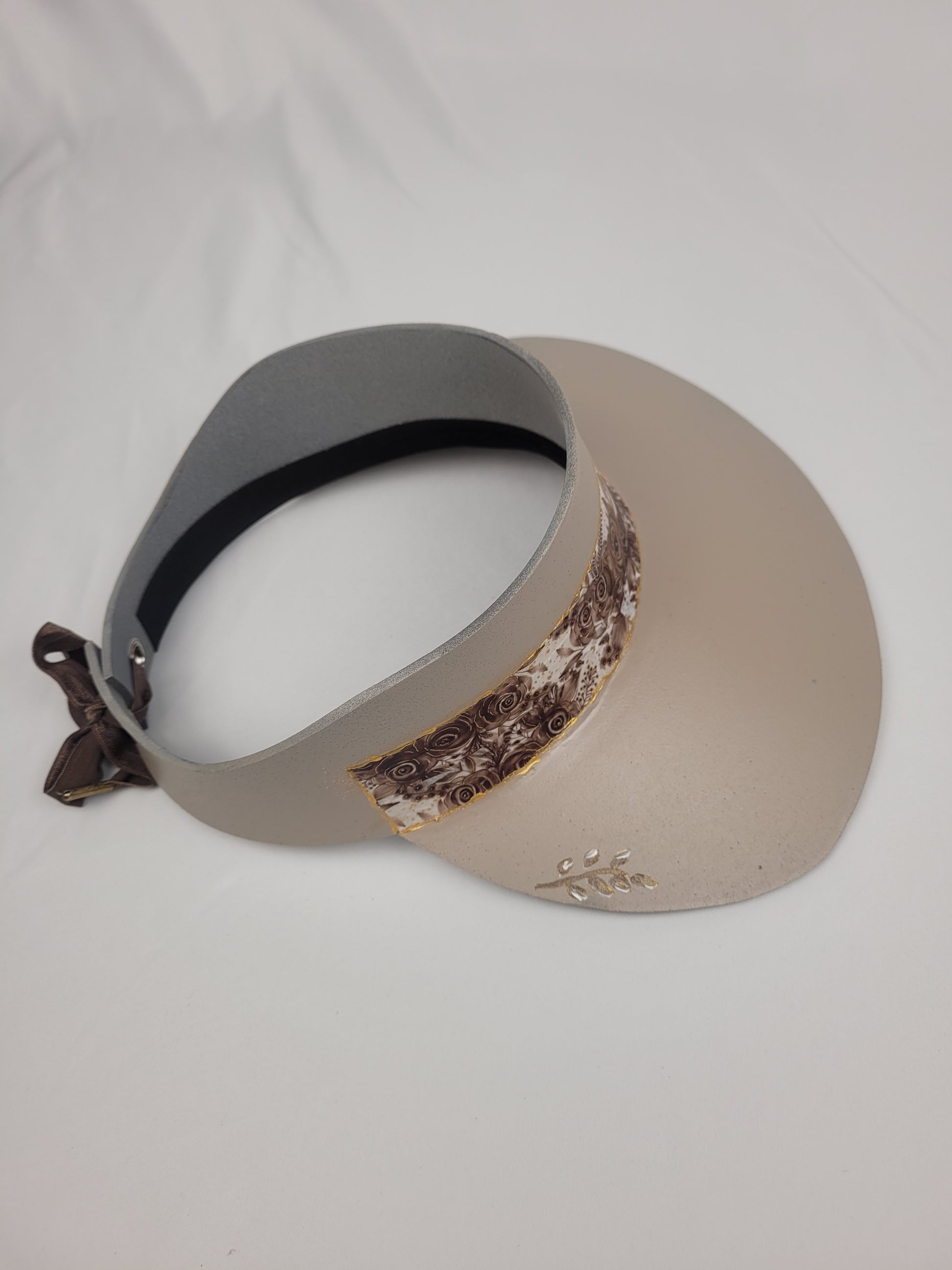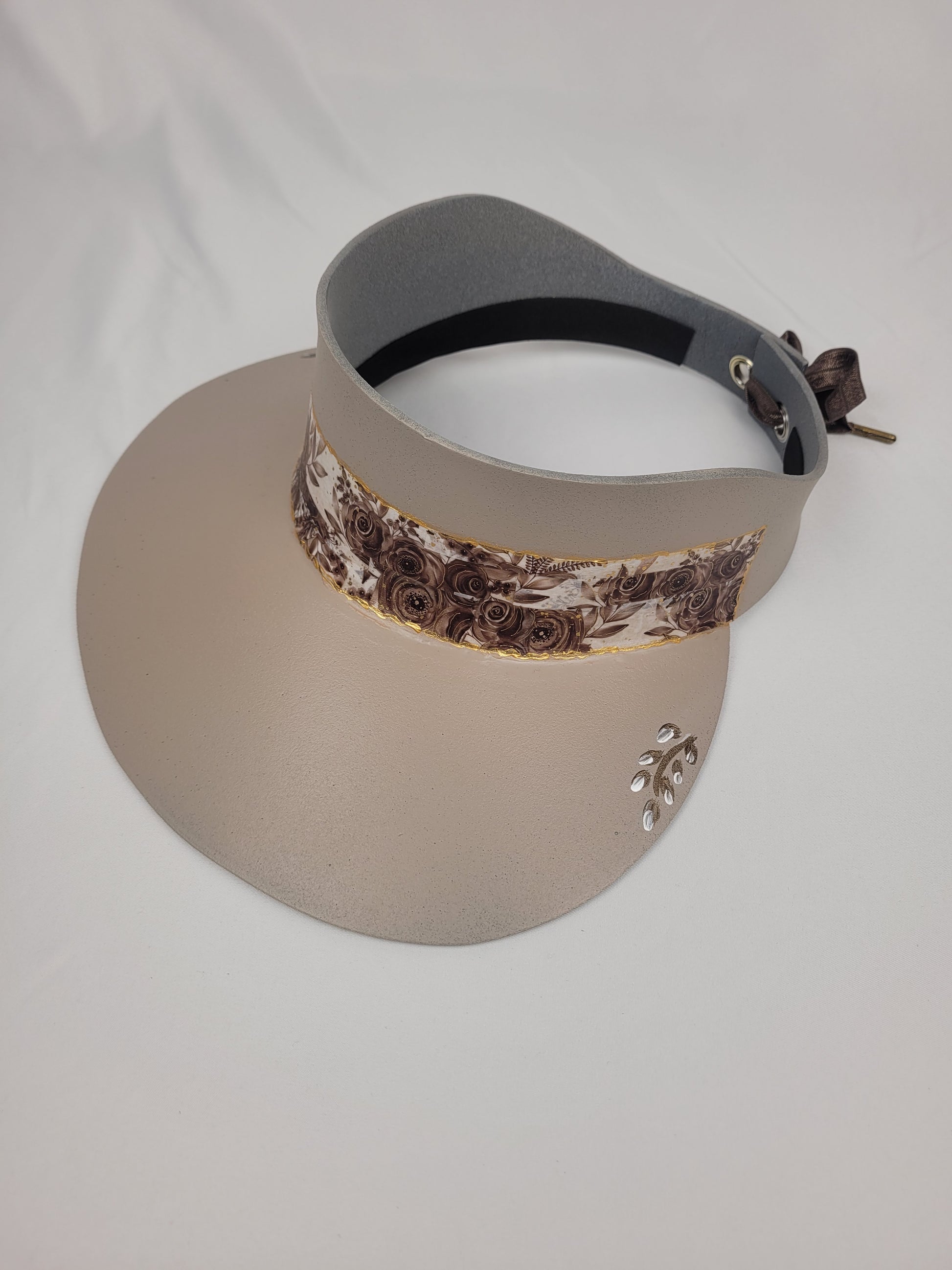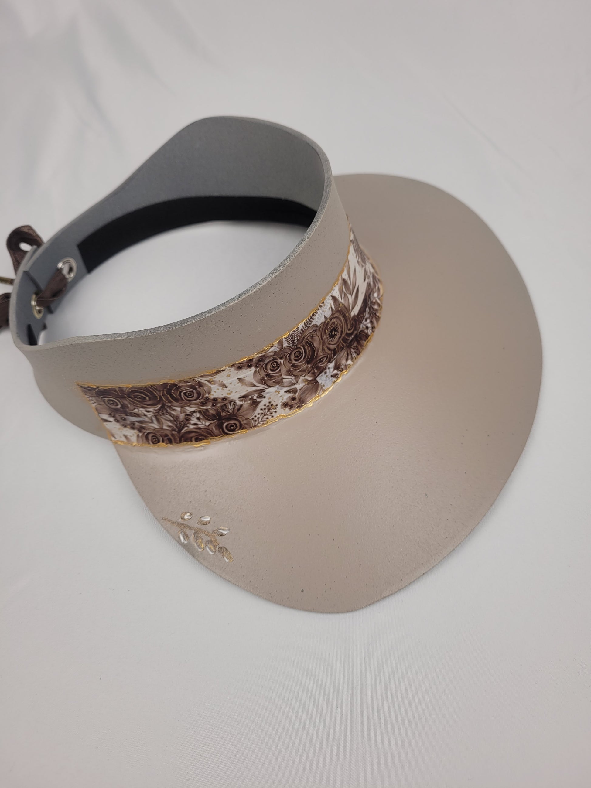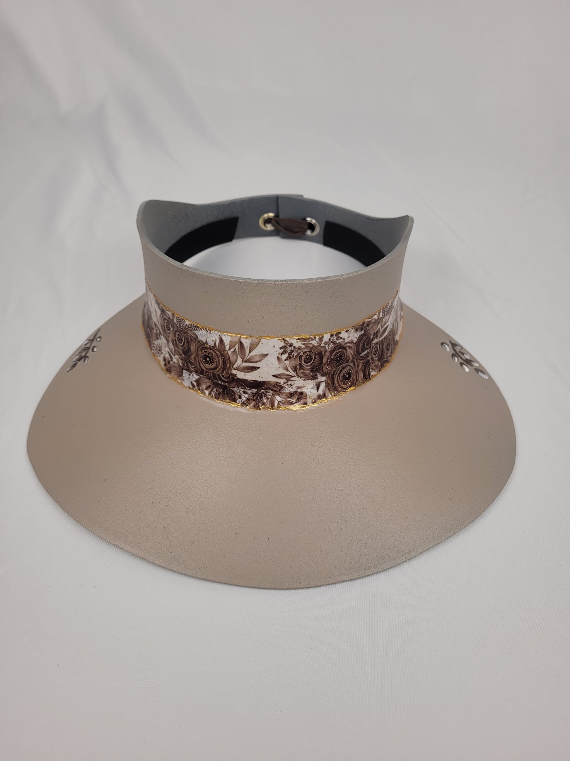 Tall Taupe "LadyEVA" Visor Hat with Neutrals Floral Band and Handpainted Floral Motifs