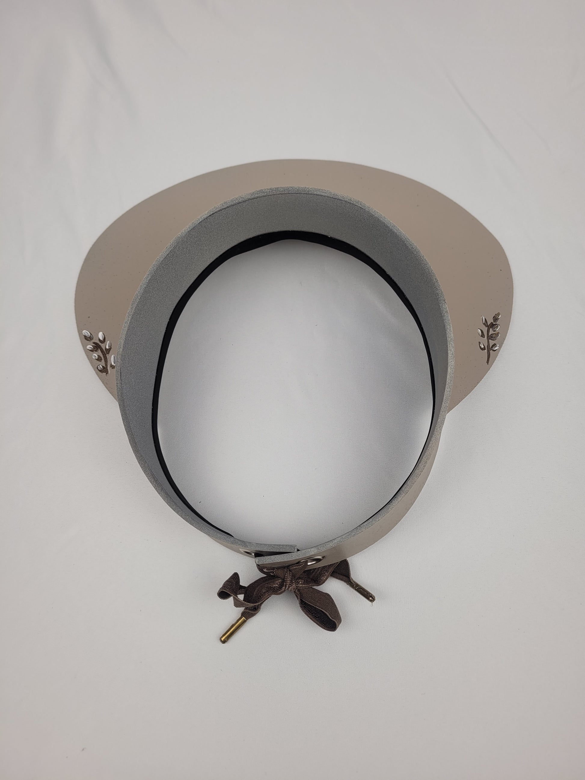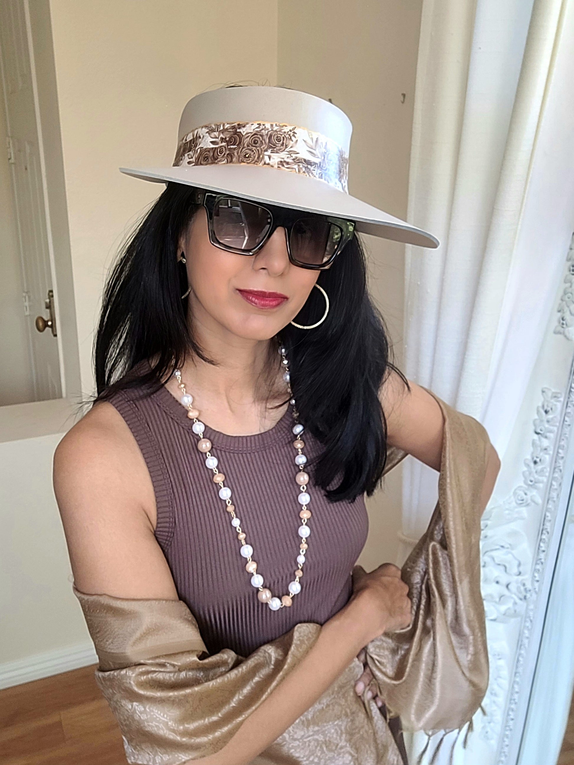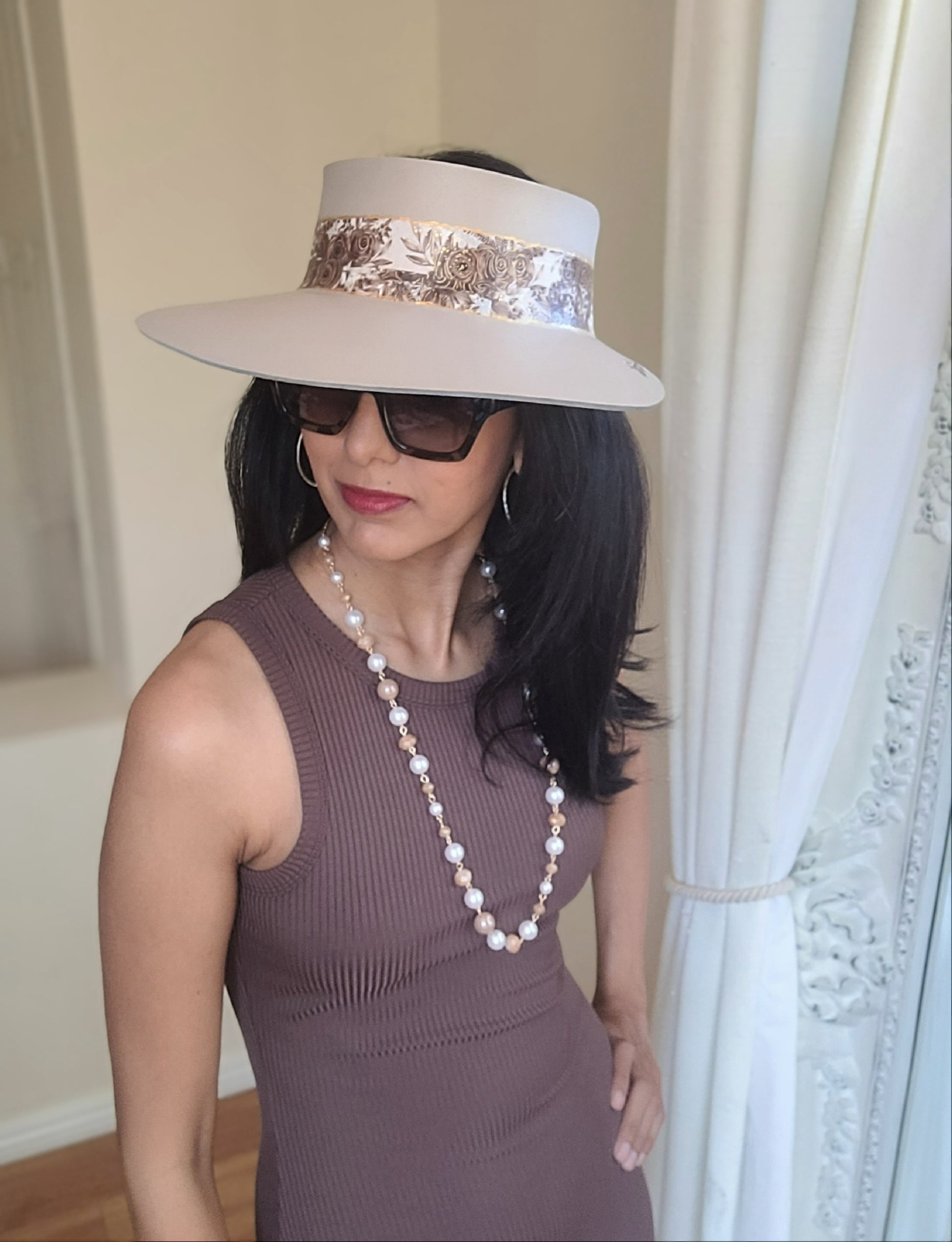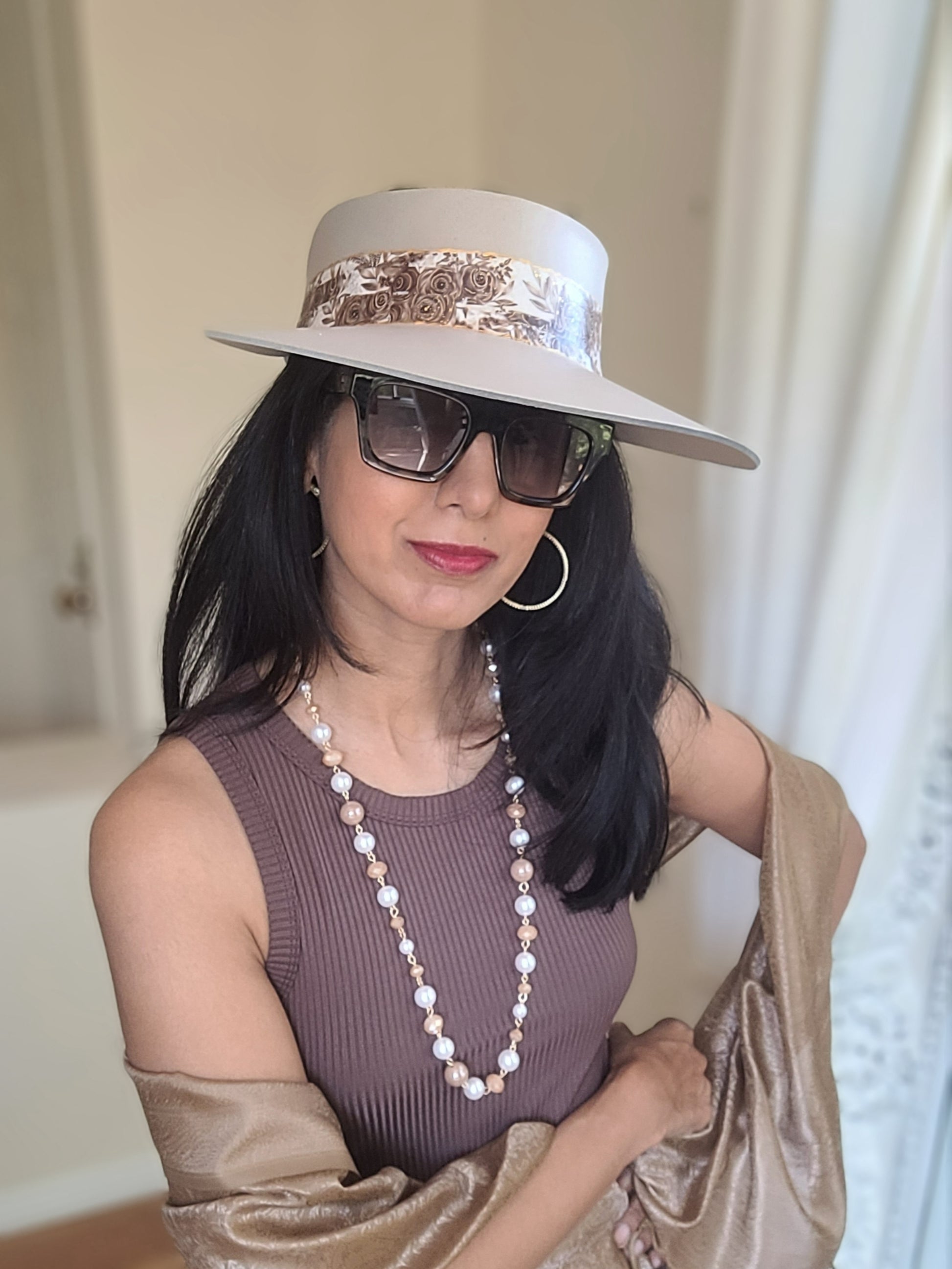 Tall Taupe "LadyEVA" Visor Hat with Neutrals Floral Band and Handpainted Floral Motifs